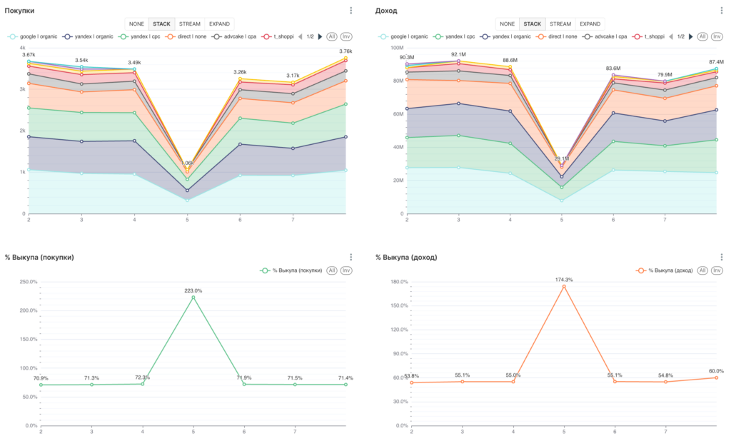 Все эти показатели нужно иметь возможность оценивать в как можно более узкой детализации. Важно понимать не только сколько пришло трафика и денег, но и откуда они пришли. Оценивать показатели в разрезе: